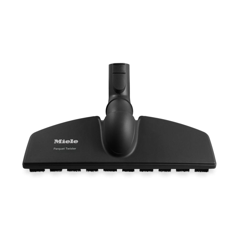 Schwarzer Staubsaugeraufsatz „Miele Parquet Twister“ mit Bürstenleisten, Ansicht von oben.